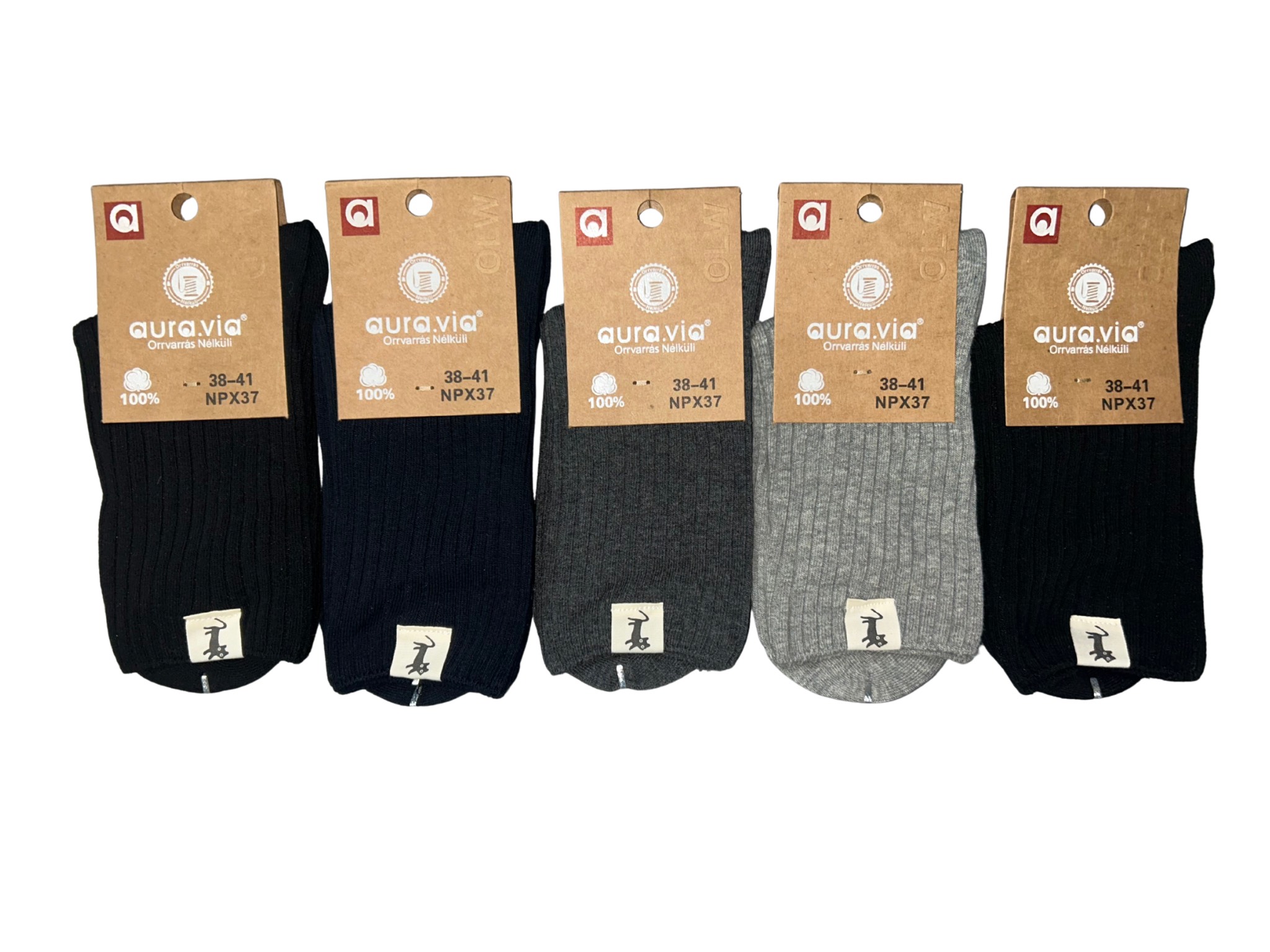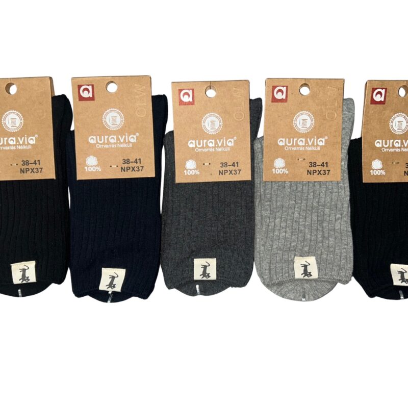 Bardzo praktyczne skarpetki bawełniane w rozmiarze 35–38 / 38–41 Aura.via. W zestawie znajduje się 5 losowych par z prezentowanych wzorów.